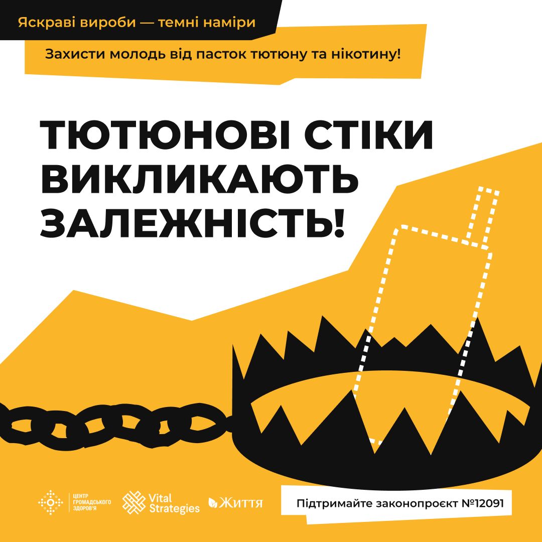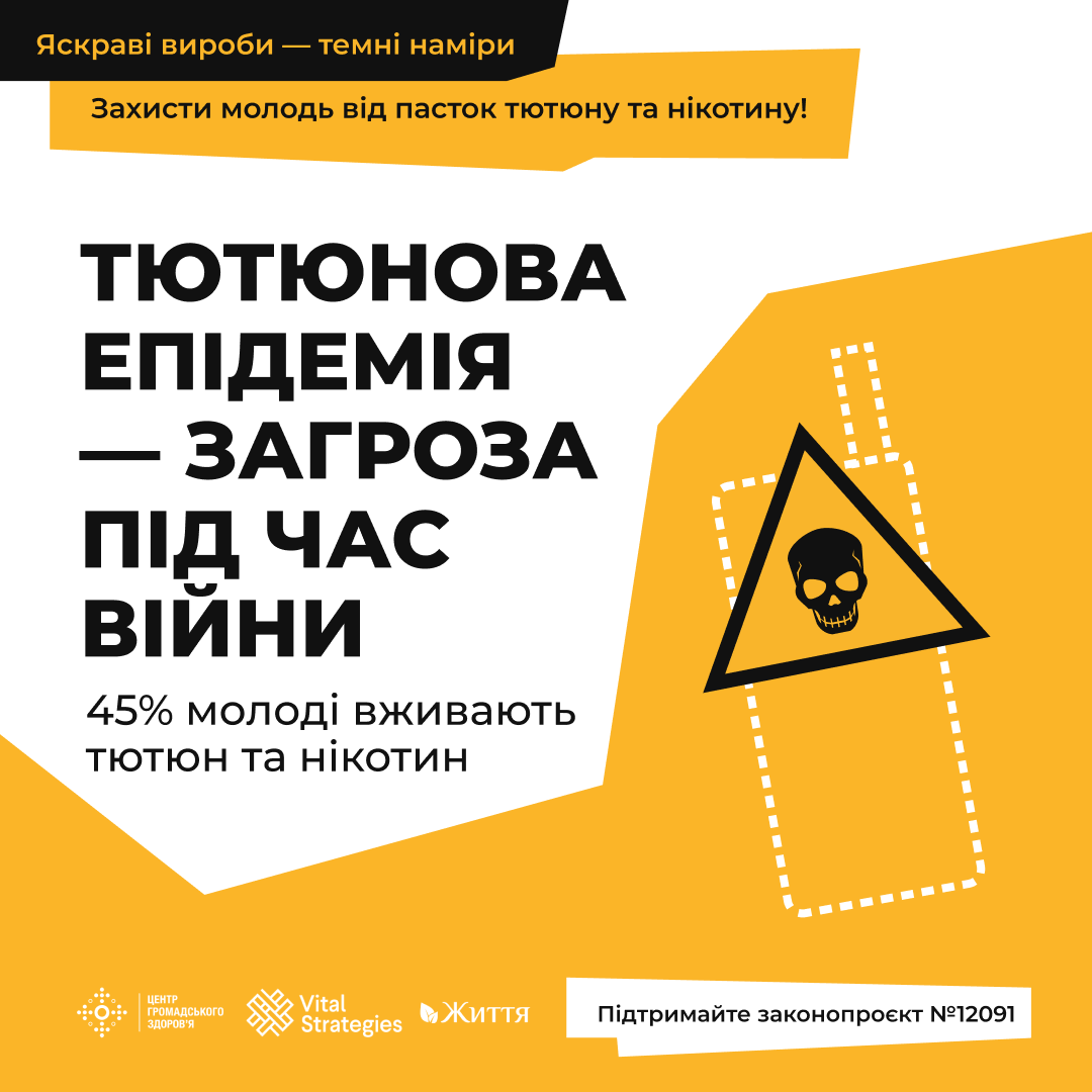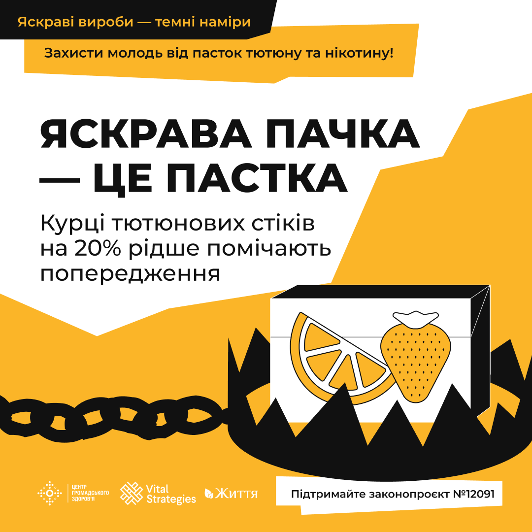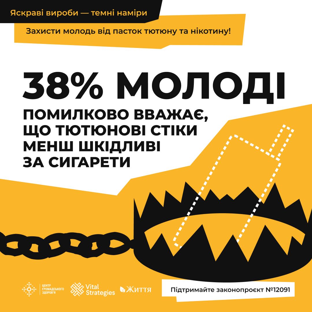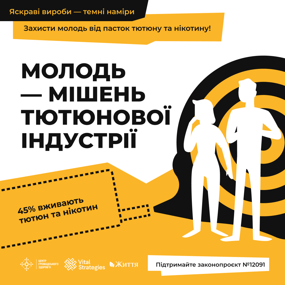 ГО "Життя" у співпраці з Центром громадського здоров’я МОЗ України проводить інформаційну кампанію «Яскраві вироби – темні наміри», спрямовану на зменшення впливу маркетингу тютюнових виробів для нагрівання (ТВЕНів) на молодь та зниження рівня їх споживання серед молодого покоління.